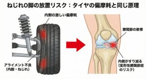 機能的O脚(ねじれO脚)やXO脚の状態は、車で例えるなら「タイヤが斜めについたまま走り続けている」ようなものです。
