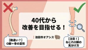 - チェック項目:つま先が膝の向きよりも極端に外側を向いていませんか?(いわゆる「ガニ股」のような歩き方)